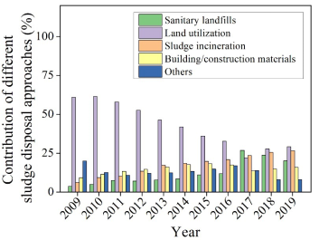 目前,污泥处置的主要技术路线有卫生填埋、焚烧、建材生产、土地利用等,在2019年,我国市政污泥中约29.3%通过土地利用进行处置,其次是焚烧(26.7%)和卫生填埋(20.1%),而建筑材料利用(15.9%)和其他方式(8.0%)贡献较小。图2显示,土地利用是我国污泥处置的主要技术路线,但是其比例从2009年的60.9%逐年下降到2019年的29.3%。与此同时,焚烧处置从2009年的6.2%上升到2019年的26.7%;而2009年时,卫生填埋仅占污泥处置总量的3.71%,2019年这一数字上升到了20.1%。从这些结果我们可以清楚看出,近些年来中国污泥的处置策略发生了较大的变化,逐渐从无序堆放向土地利用、焚烧逐渐转变,并趋于多元化,这表明中国政府在污泥的安全和标准化处置方面取得了巨大的进步。
